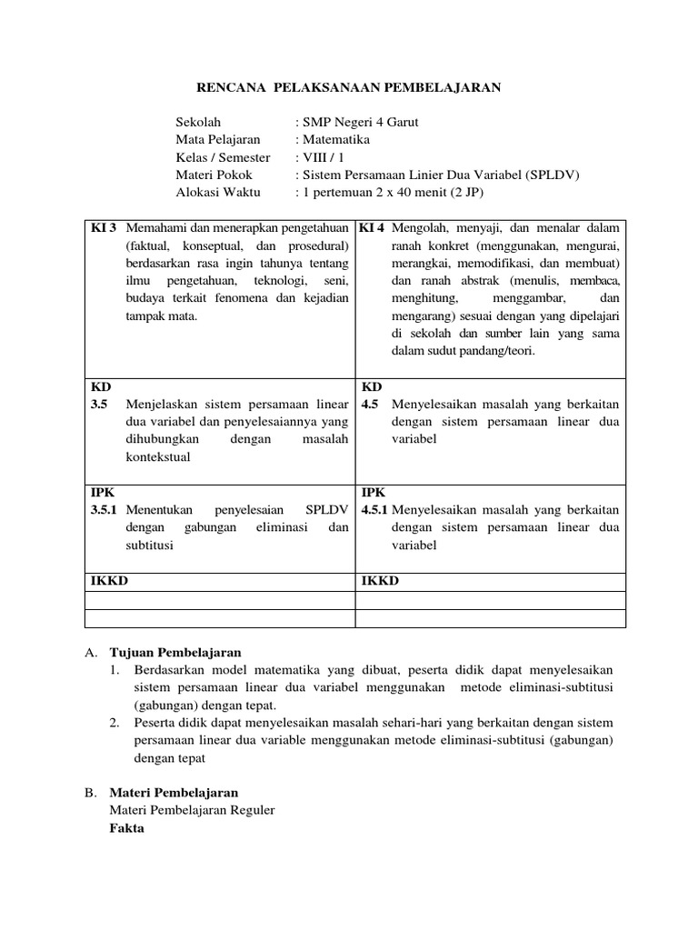 Rpp Sistem Persamaan Linear Dua Variabel Kurikulum 2013 Smp …
