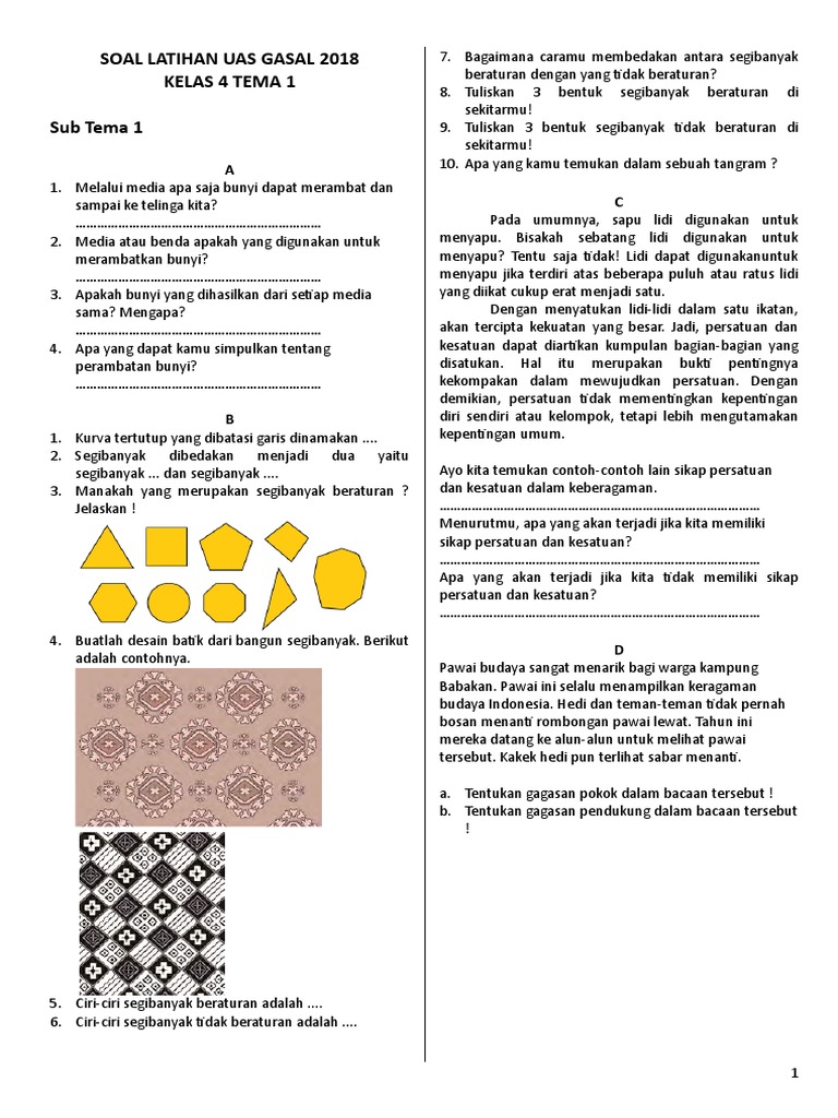Soal Latihan Uas Gasal 2018 Kelas 4 Tema 1 Sub Tema 1