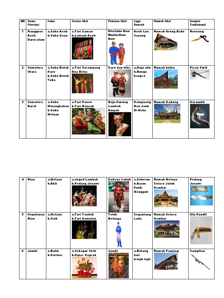 34 Provinsi Rumah adat, Pakaian Adat, Tarian Tradisional, Senjata …