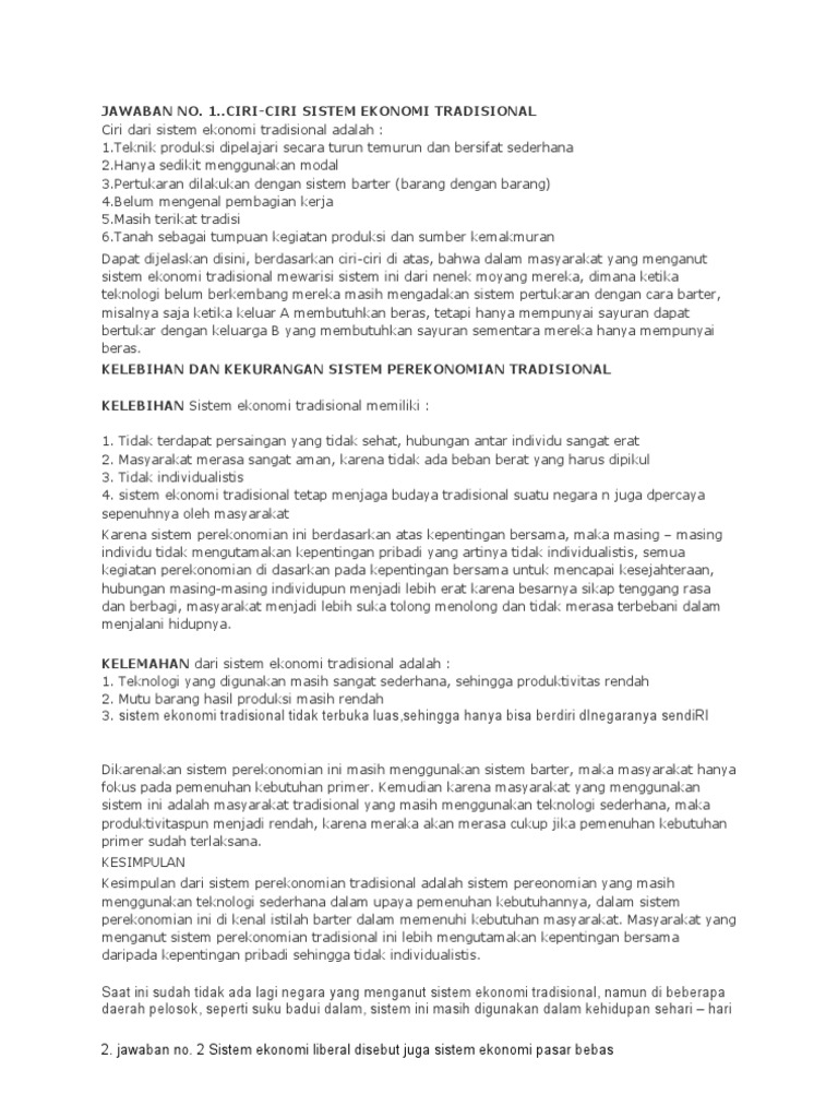 Ciri Ciri Sistem Ekonomi Tradisional Brainly