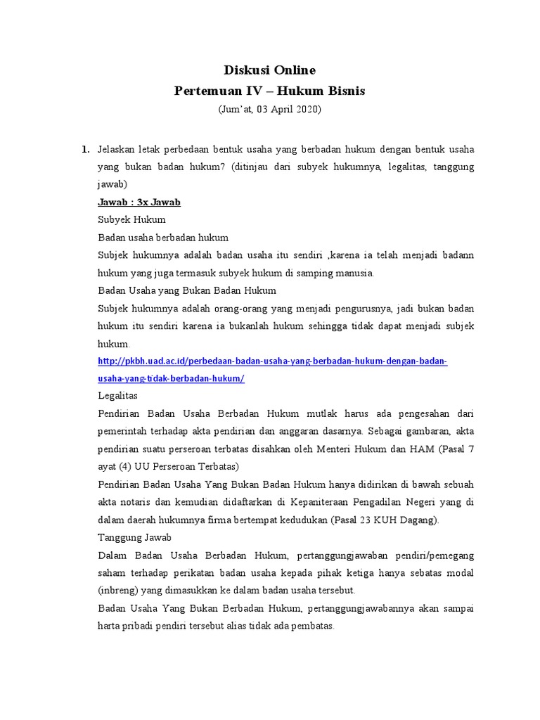 Diskusi Online Pertemuan IV – Hukum Bisnis
