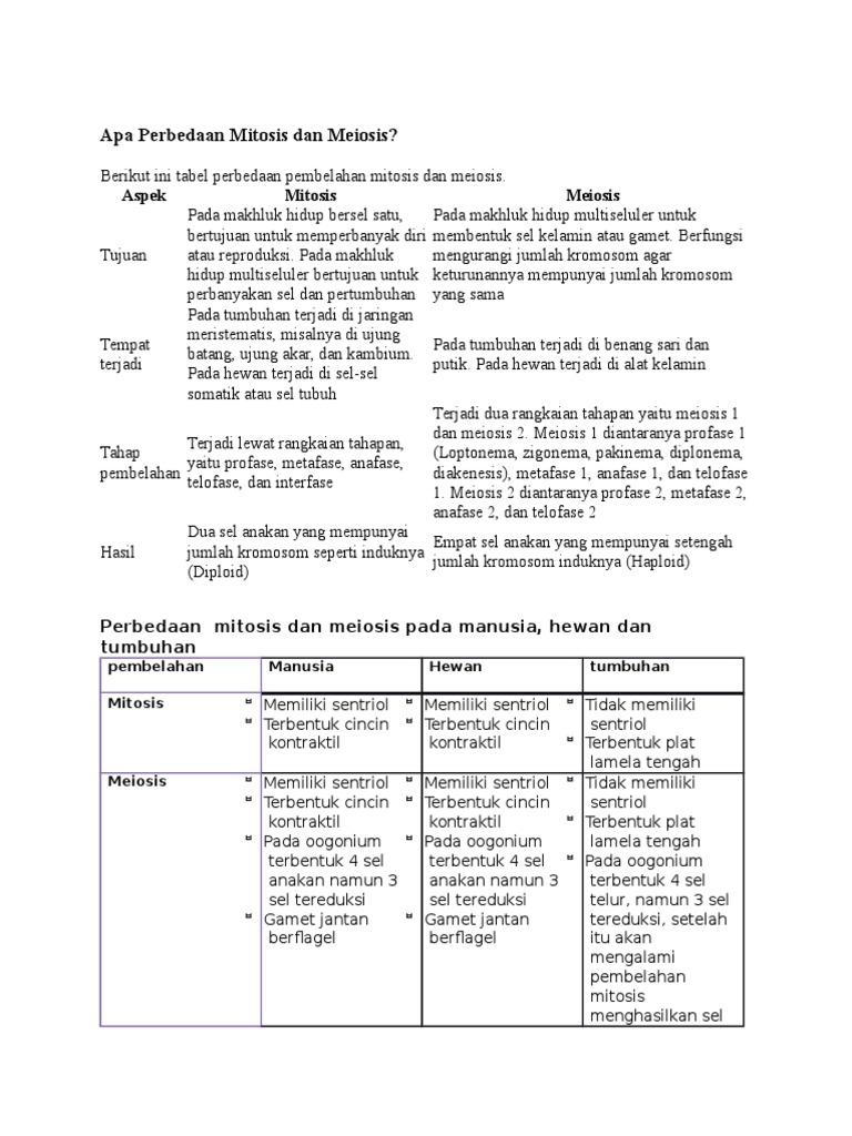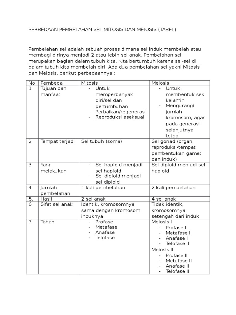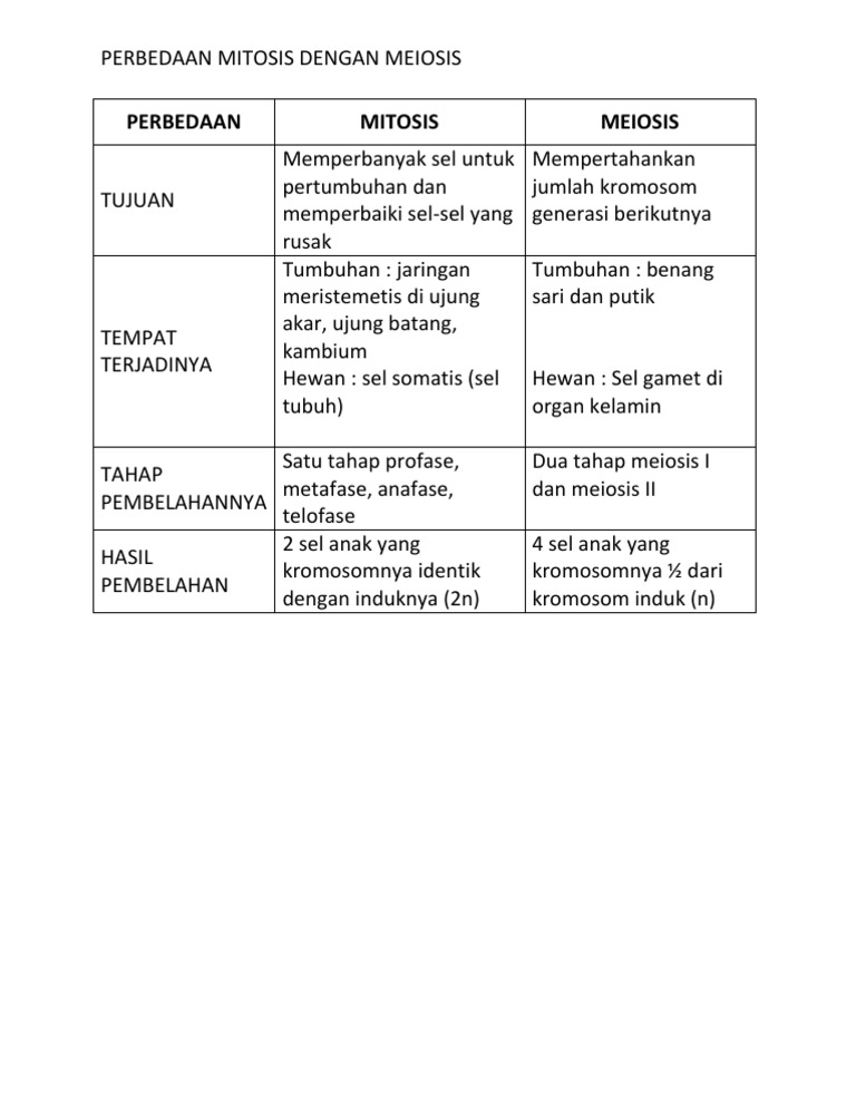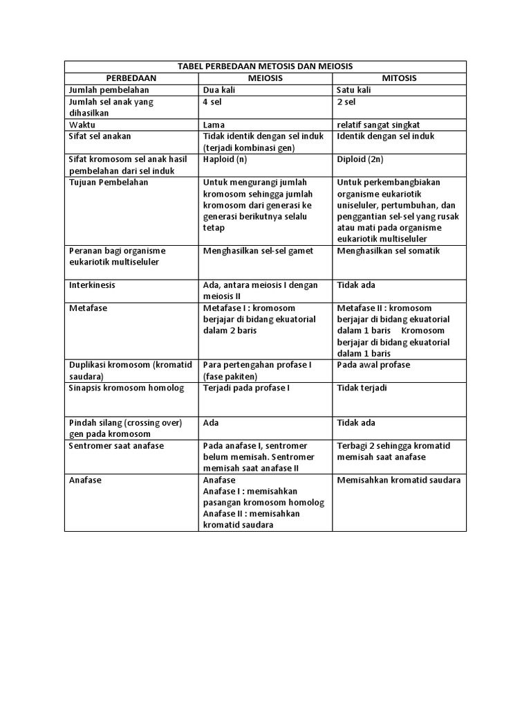 Perbedaan antara pembelahan mitosis dan meiosis dalam tabel …