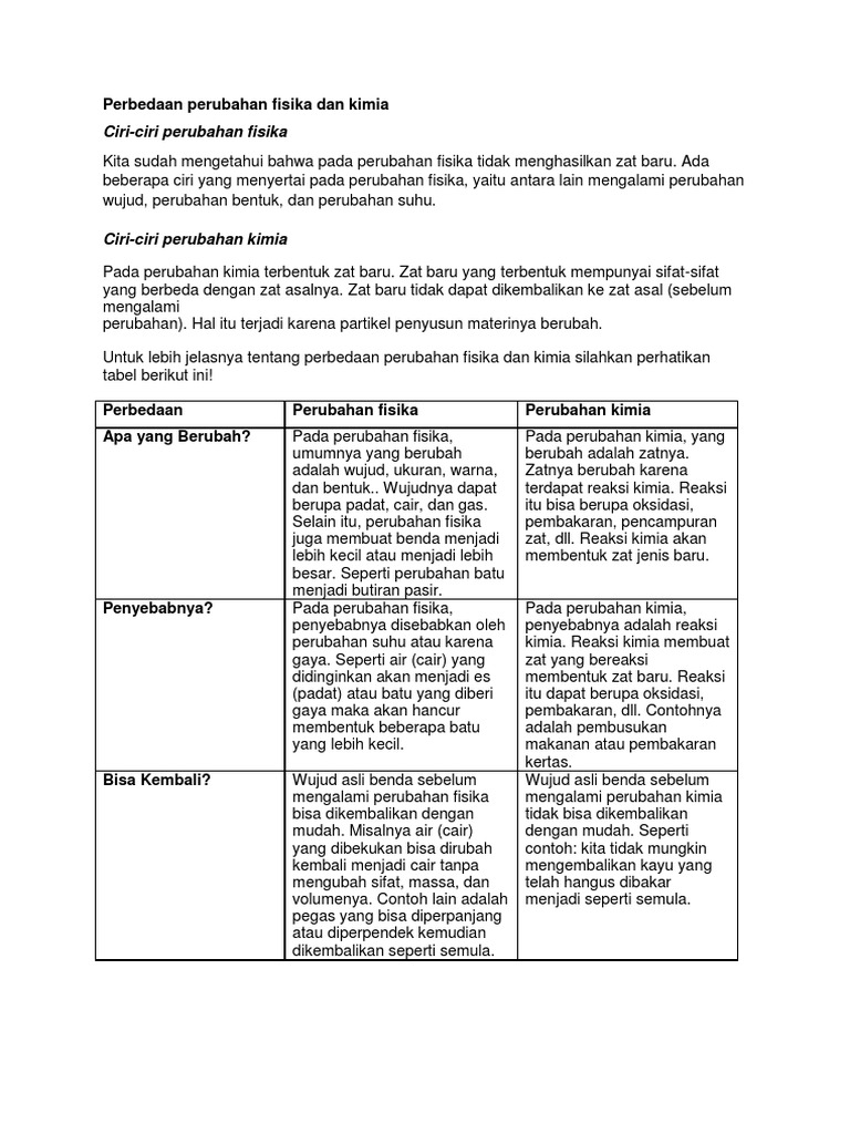 Jelaskan perbedaan perubahan fisika dan perubahan kimia suatu zat tetapi sebelumnya Isilah tabel - Brainly.co.id