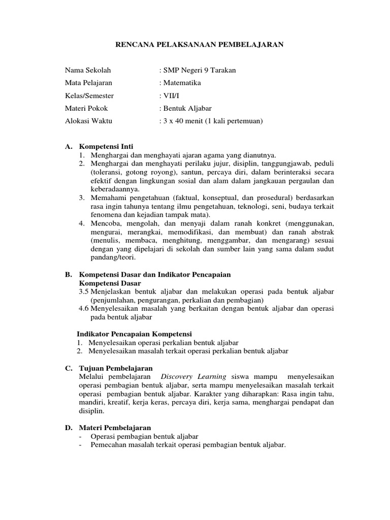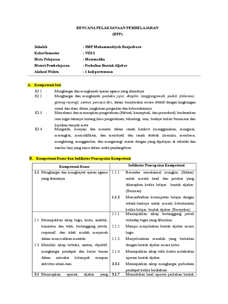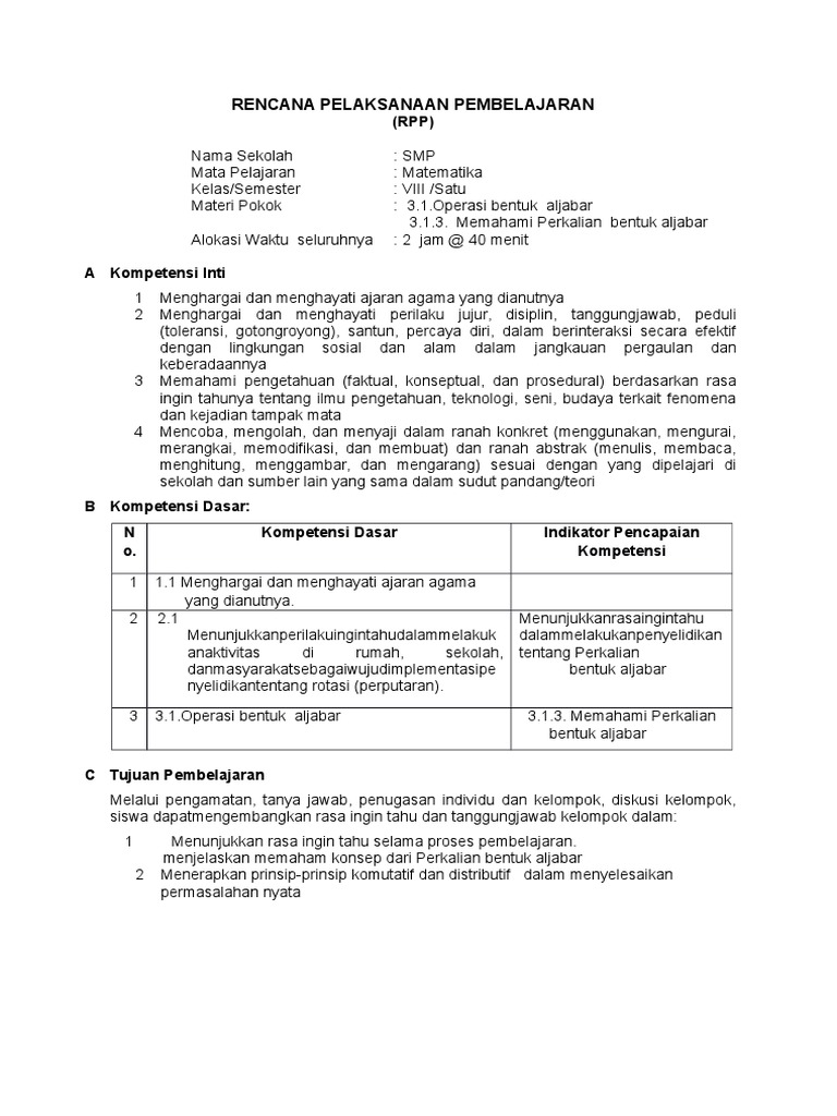 DOC) RPP Perkalian Bentuk Aljabar (kelas 8) | Achi Pasha …