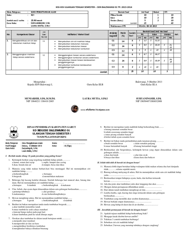 Kisi Kisi Dan Soal Uts 1 Ipa Kelas III