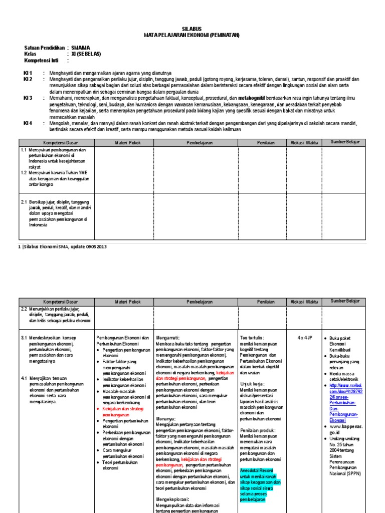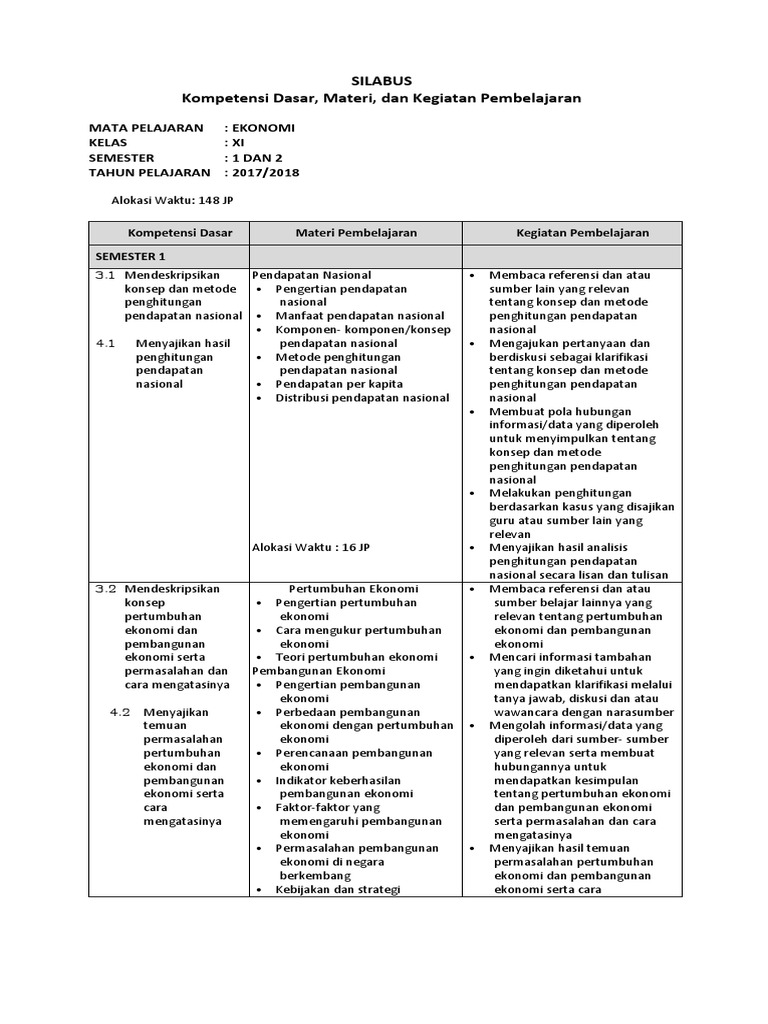Silabus Ekonomi kelas XI Kurikulum 2013