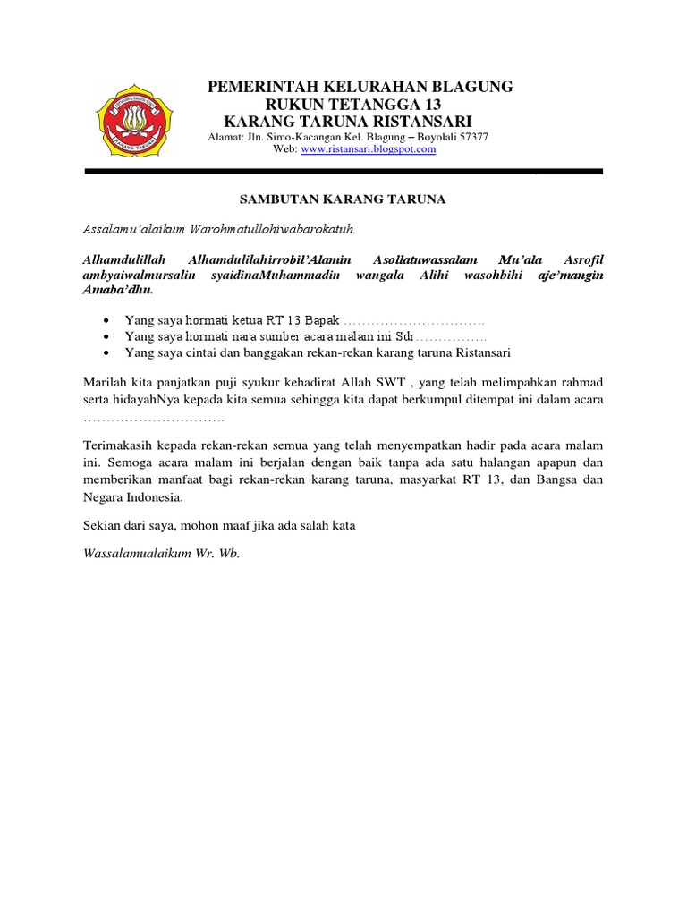 Teks Sambutan Ketua Karang Taruna