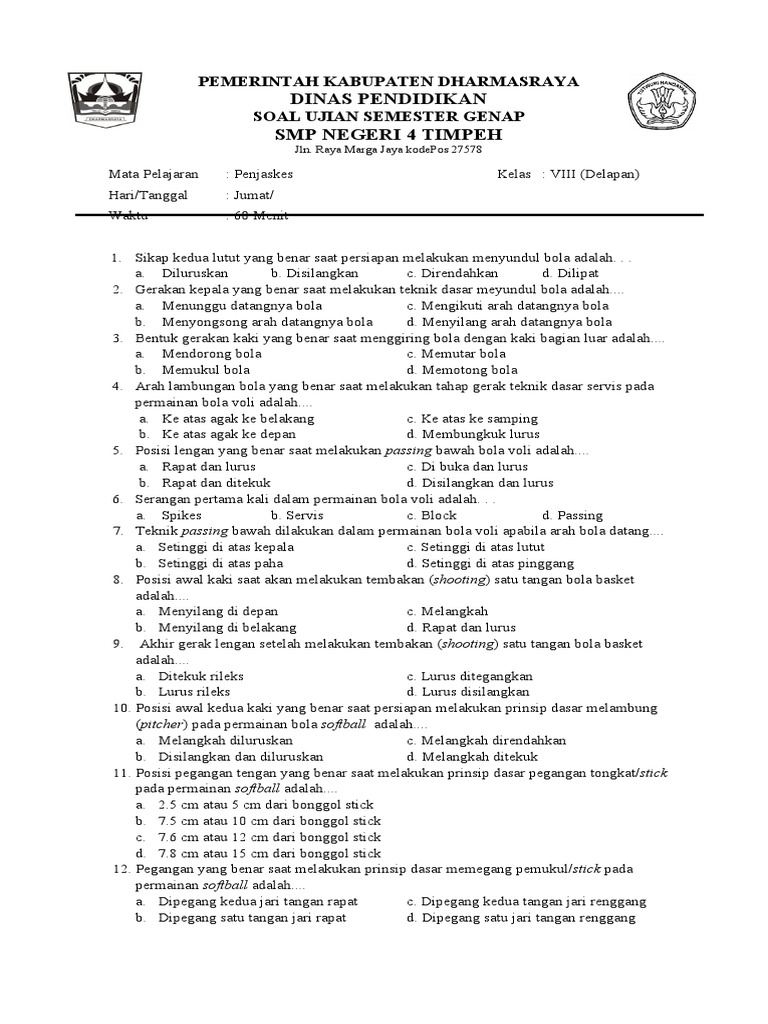 Contoh Soal Ujian Mid Semester PJOK Kelas VIII SMP/MTs Semesetar 2