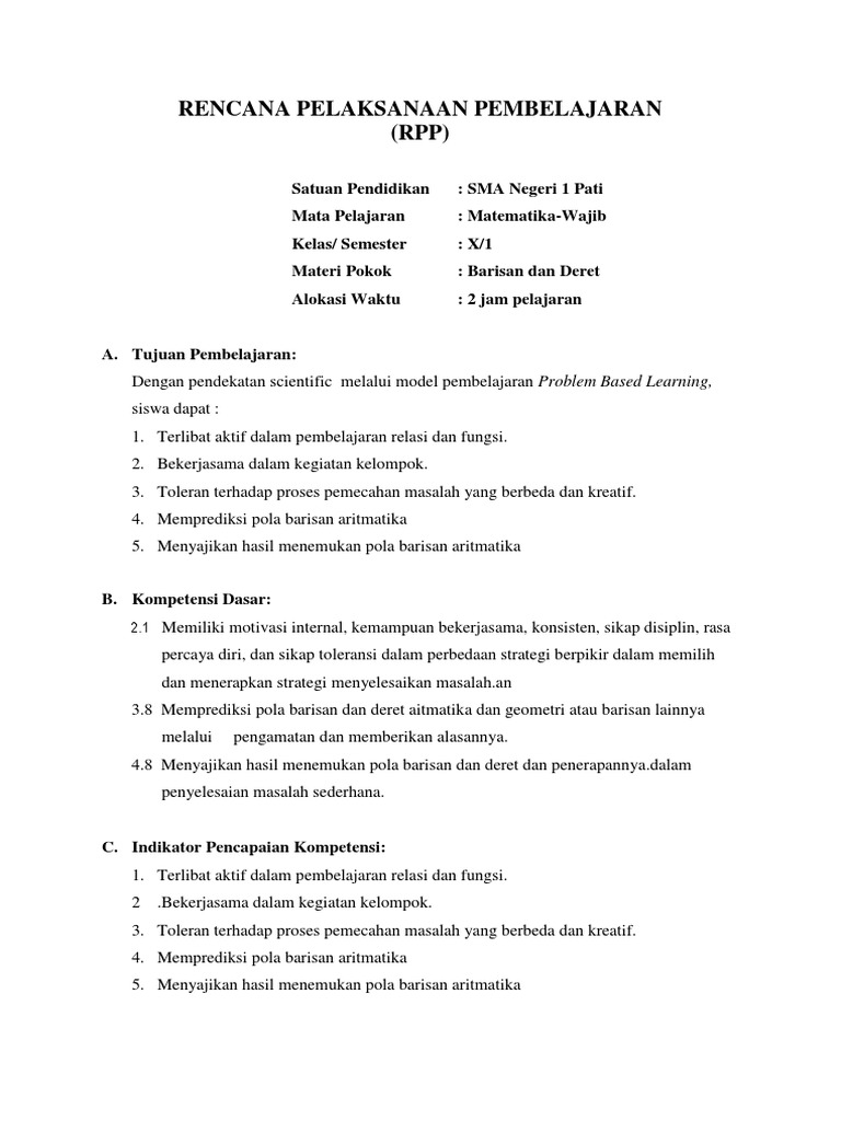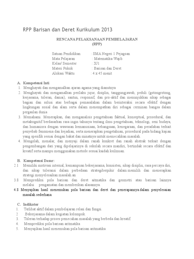 Rpp Barisan Dan Deret Aritmatika Kurikulum 2013 Pdf