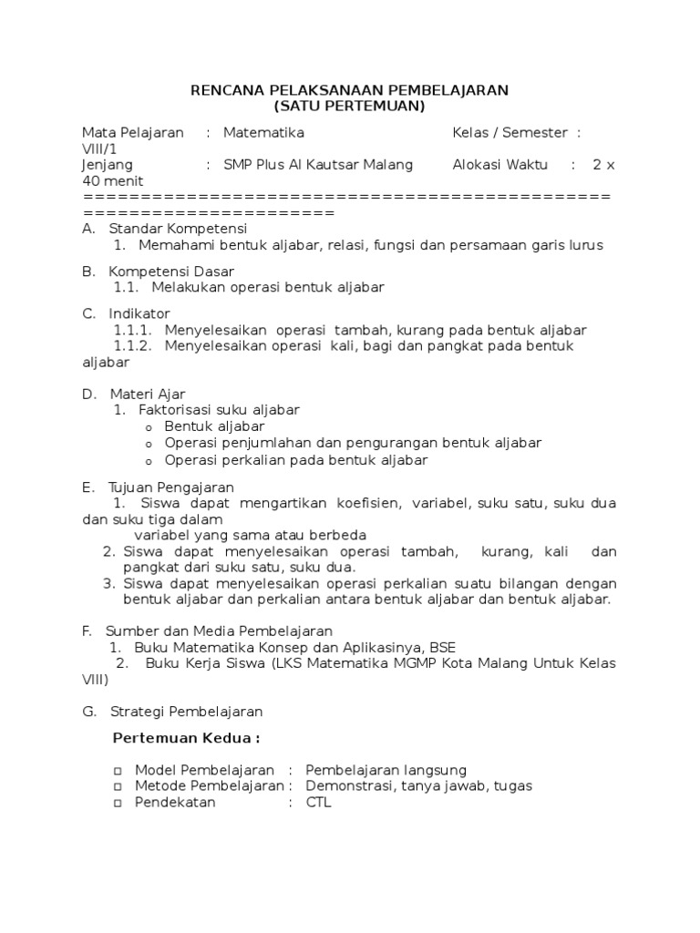 DOC) RPP Perkalian Bentuk Aljabar (kelas 8) | Achi Pasha …