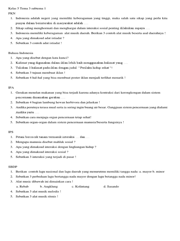 Soal UAS 1 Penilaian Akhir Semester kelas 5 SD Tema 3 K13 (Bagian II)