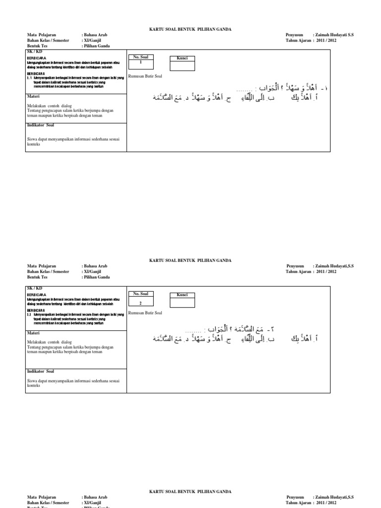 Kartu Soal Bentuk Pilihan Ganda BAHASA ARAB