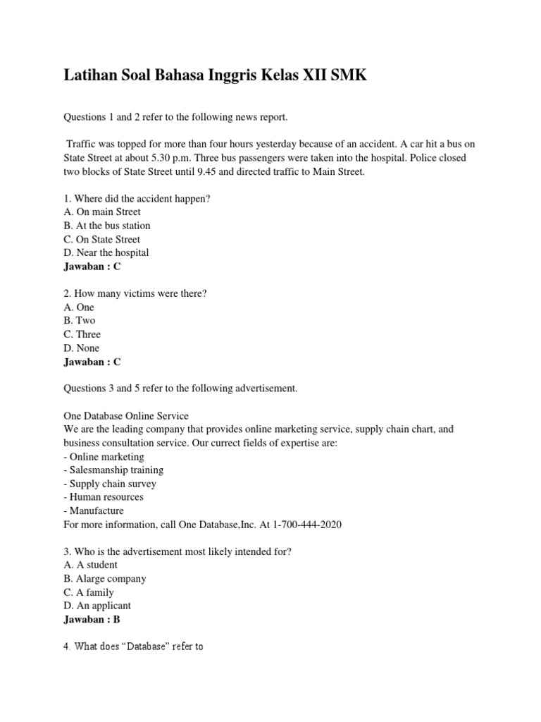 Soal Bahasa Inggris Kelas 12 Smk Beserta Jawabannya