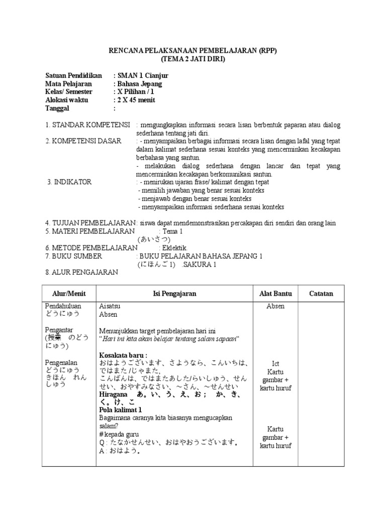 RPP Bahasa Jepang Kelas X Kurikulum 2013 SMKN 2.doc - RENCANA PELAKSANAAN PEMBELAJARAN NAMA SEKOLAH MATA PELAJARAN KELAS/SEMESTER TOPIK ALOKASI WAKTU | Course Hero