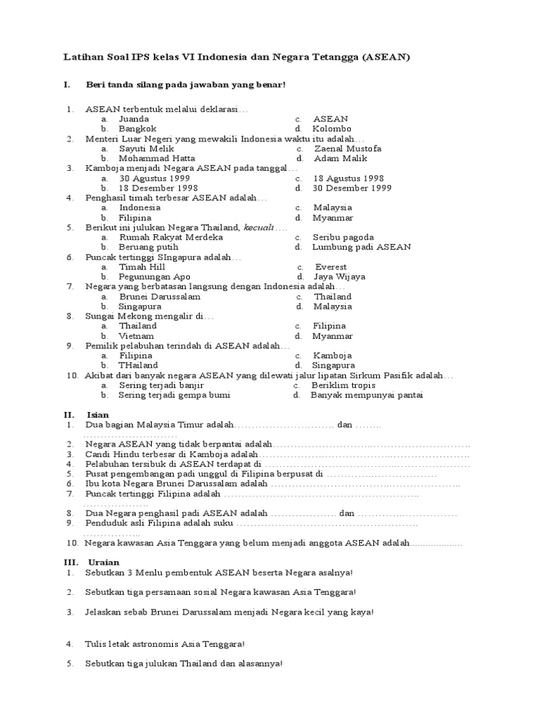 Latihan Soal IPS Kelas VI Indonesia Dan Negara Tetangga