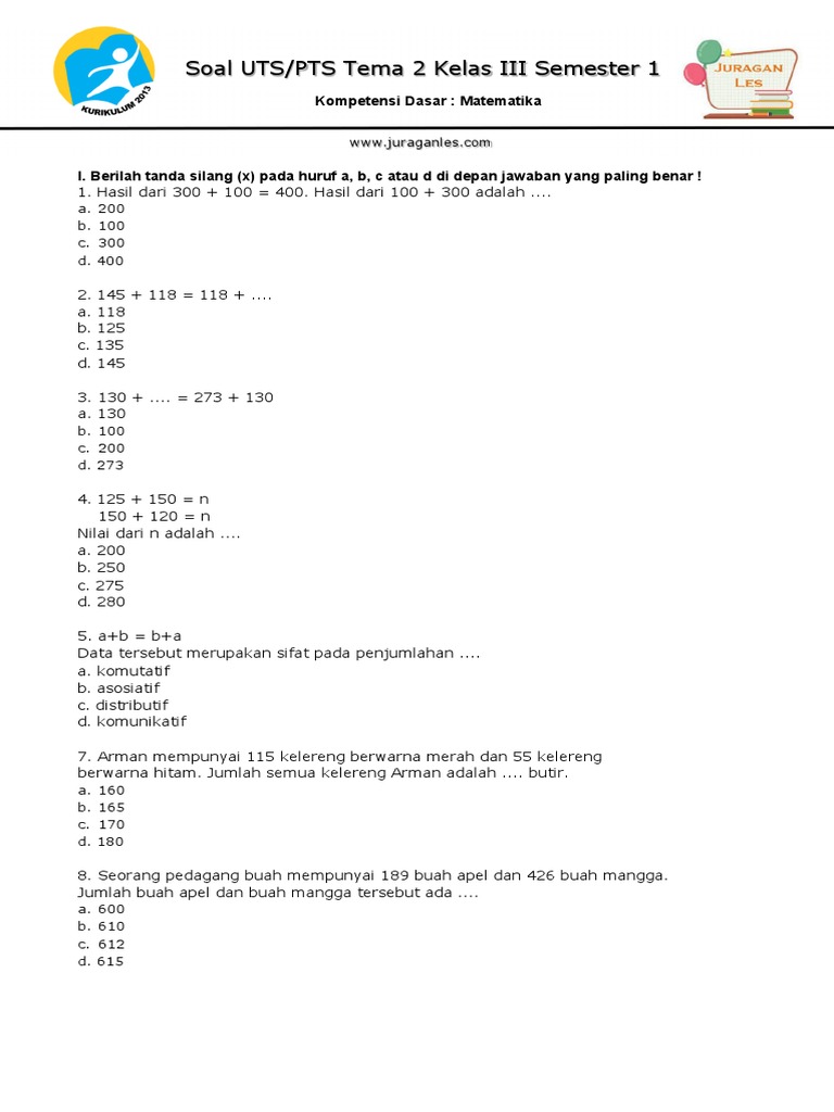 Soal UTS Matematika Kelas 3 Semester 1 Terbaru Tahun Ajaran 2018 …