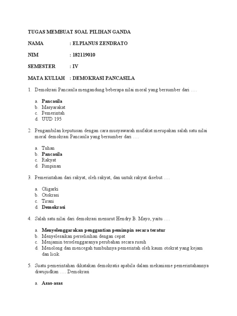 Tugas Membuat Soal Pilihan Ganda Nama: Elpianus Zendrato NIM: 182119010 Semester: Iv Mata Kuliah: Demokrasi Pancasila