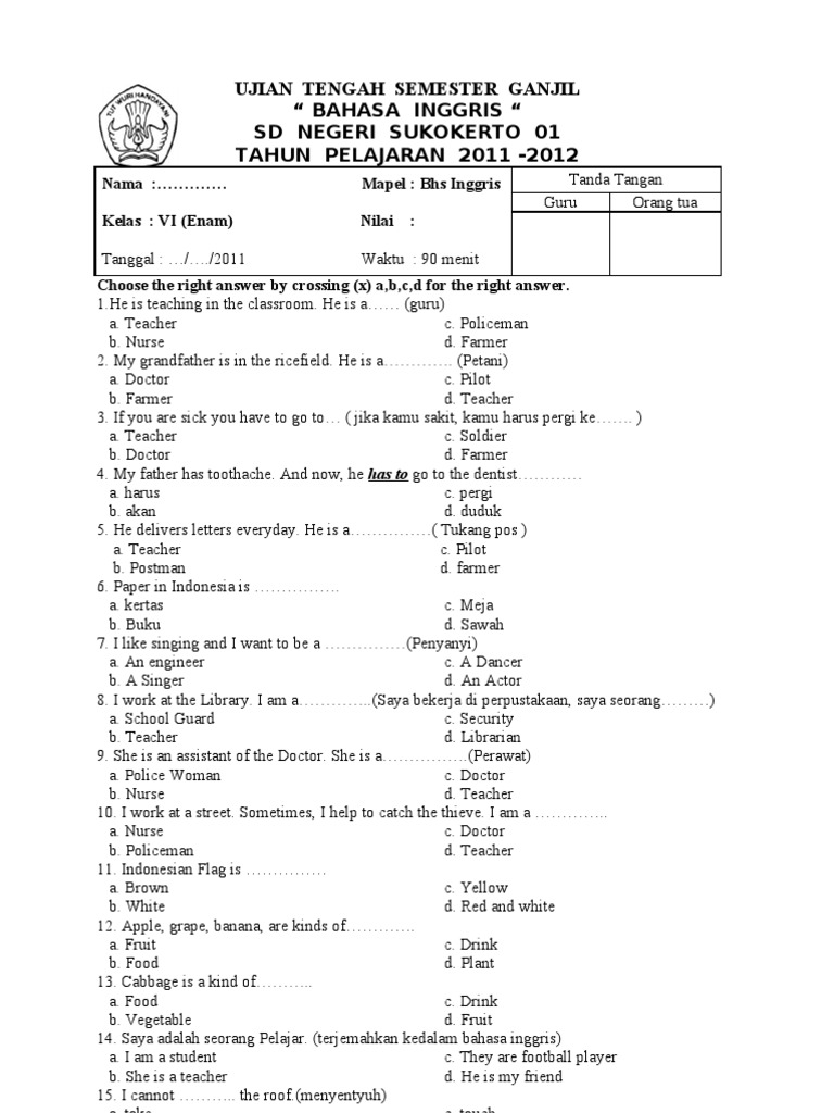 Soal UTS Bahasa Inggris Kelas 6 Semester 1 Terbaru Tahun 2018 …
