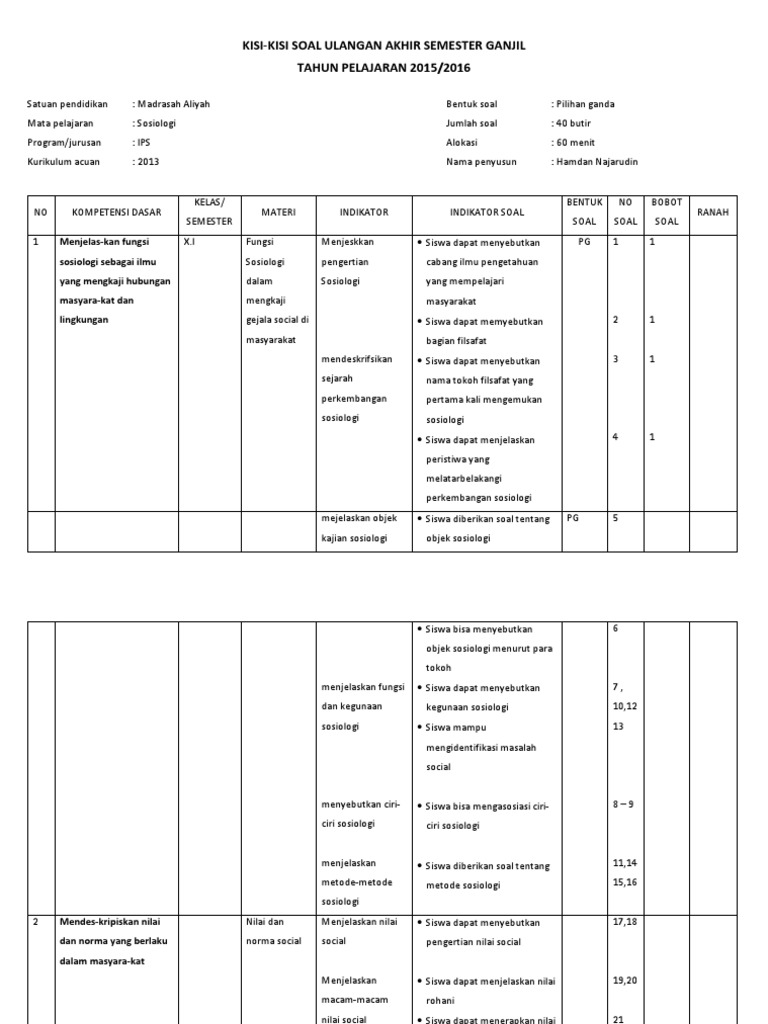 Kisi Kisi Soal Sosiologi Kelas X Semester Genap 1 Soal UAS …