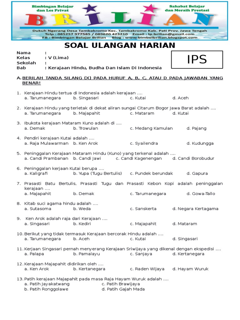 Soal IPS Kelas 5 SD Bab 1 Kerajaan Hindu, Budha Dan Islam Di …