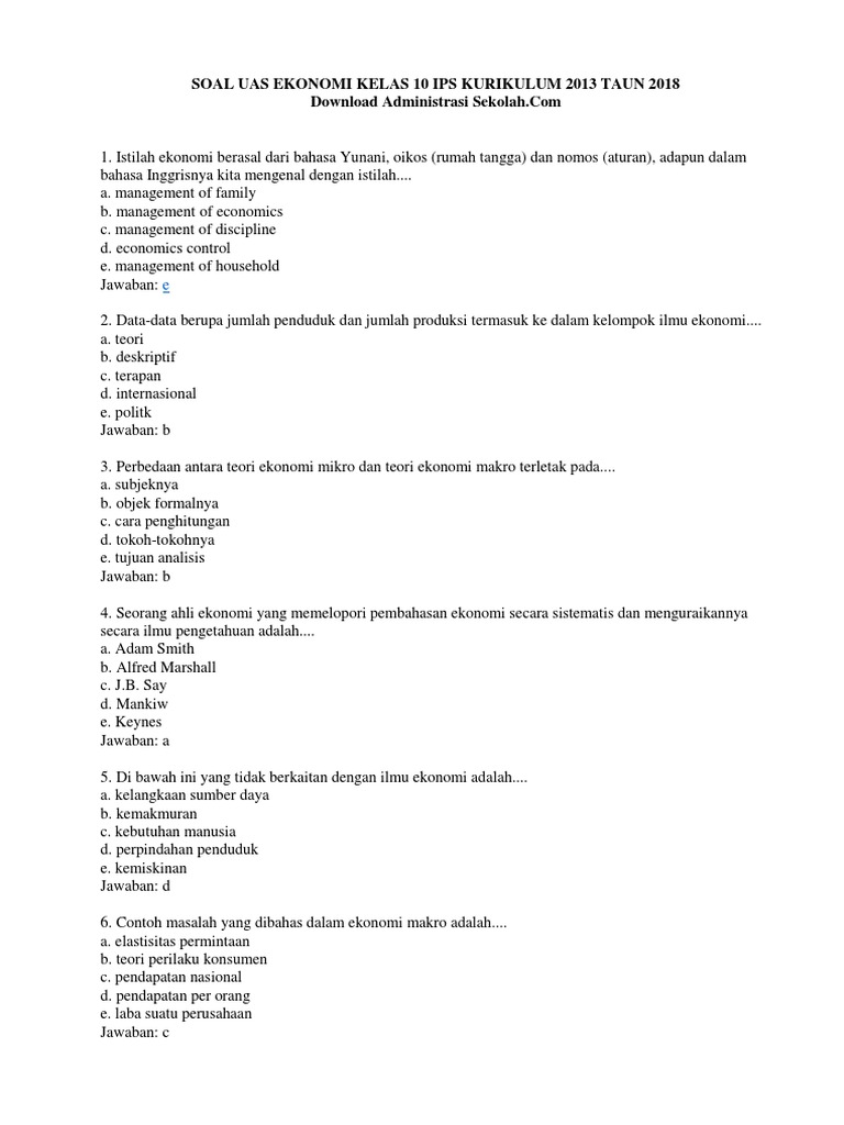 Soal Ekonomi Sma Kelas 10 Semester 1 Dan Kunci Jawaban - Guru Galeri