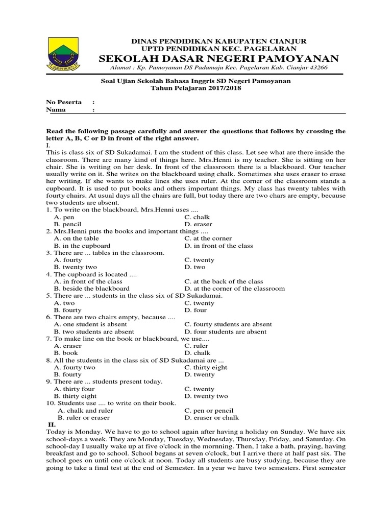 Contoh Soal Ujian Sekolah Bahasa Inggris SD Kelas 6 - Belajar …