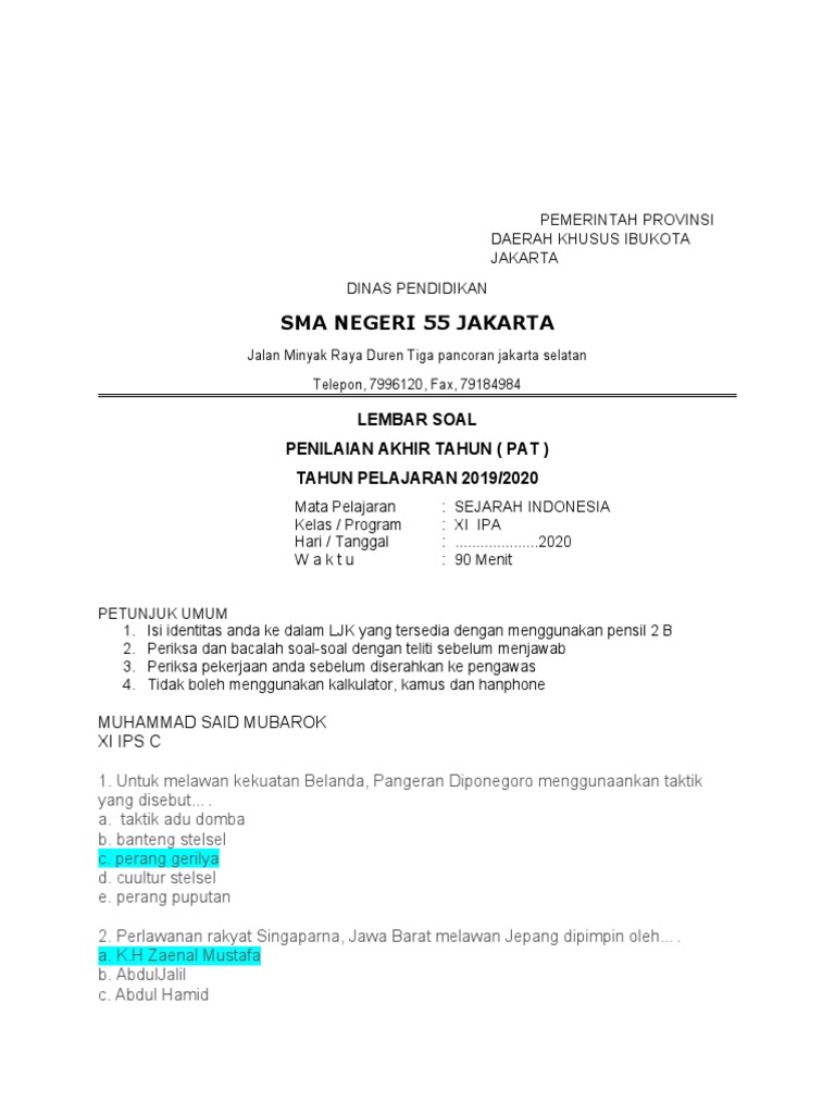 Sma Negeri 55 Jakarta: Lembar Soal Penilaian Akhir Tahun ( Pat …