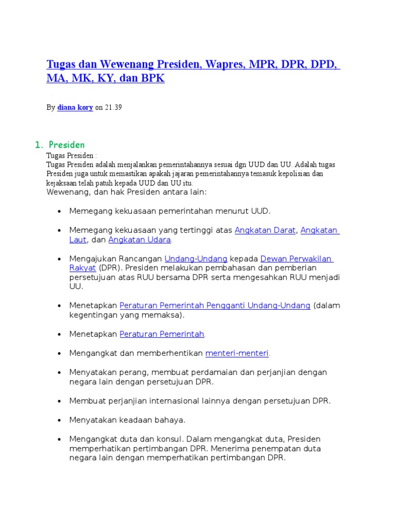 Tugas Dan Wewenang Lembaga Tinggi Negara Dan Presiden