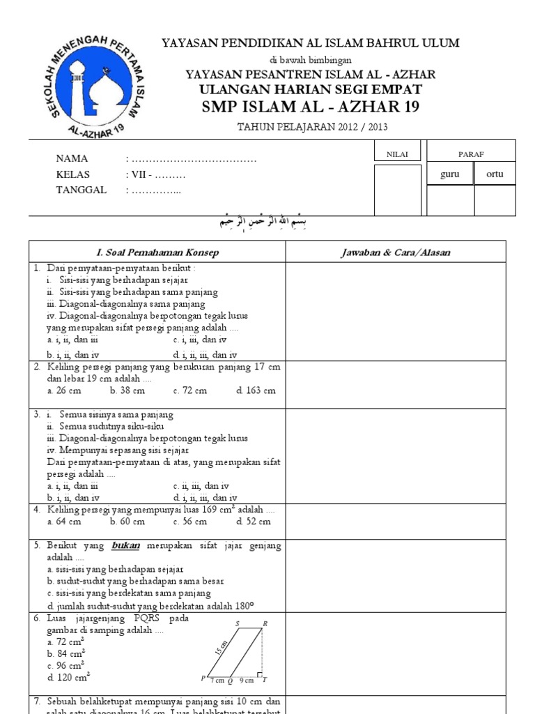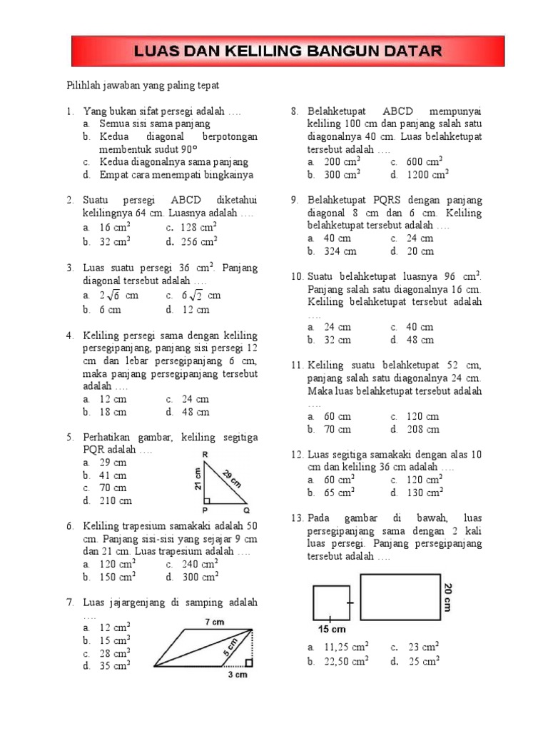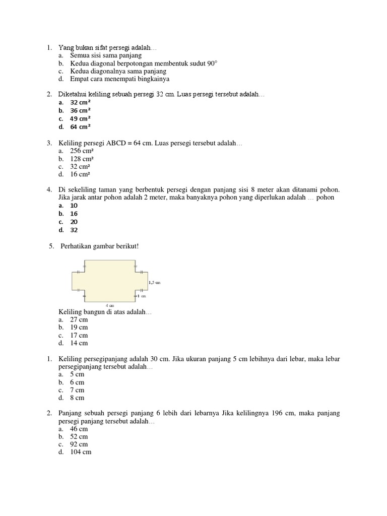 SOAL DAN JAWABAN SEGI EMPAT, PERSEGI PANJANG & TRAPESIUM